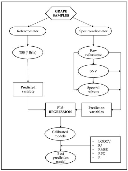 The proposed procedure was based on using the samples that the winegrower usually takes before carrying out the harvest. The methodology involved data acquisition (grape sampling, TSS, and spectral measurements), spectral data processing (standard normal variate (SNV) transformation and spectral subset organization), and PLS regression (model fit, validation, and selection). Figure 1 summarizes the workflow.