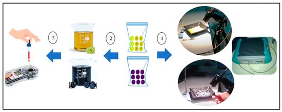 After the spectral data were captured, the grape samples were crushed to obtain the must. TSS (°Brix) was determined at 20 °C using an Atago PR1 digital refractometer (Atago Co., Tokyo, Japan), with a range of 0–45 °Brix and accuracy of ±0.1 °Brix.