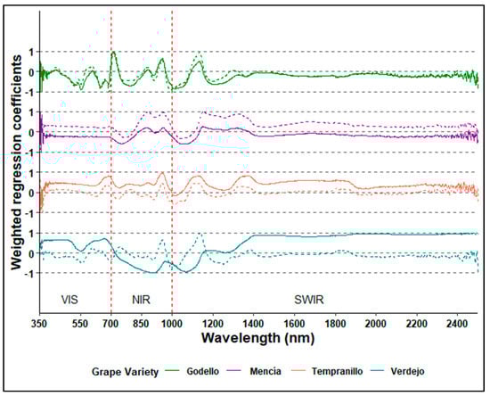 Figure 4 depicts variations in weighted regression coefficients with respect to wavelengths. The fact that the range 400–1000 nm contains the most important coefficients in the regressions explains why predictions based on the NIR spectral range (Table 4) proved better than those for the full spectrum (Table 3). The spectral behaviors of the four grape varieties were very different, while the maximum and minimum weight values were in the range of 400–1500 nm, which is the range that provides information on the chemical groups present in grape skins. Supplementary Materials S2 contains complementary information about weighted regres-sion coefficients of the best models for grape varieties (Figure S1).