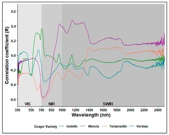 Figure 5 shows that the reflectance values most correlated with TSS were in the 700–750 nm range, and this correlation was negative. R2 values varied between R2 = −0.59 for Mencía and Tempranillo and R2 = 0.38 for Verdejo. The Mencía variety also had another relative maximum regression value at 1000 nm (R2 = 0.45). The correlogram for Godello was different from the others, with R2 = 0.43 in the range 600–700 nm.