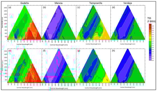 RMSE values were between 0.4 °Brix and 2 °Brix. The best and worst results (lowest and highest RMSE values, respectively) were obtained for the Mencía and Godello varieties. In all cases, SNV transformation slightly improved RMSE values (Figure 6e–h, and Table 4). Certain areas showed better correlations, which indicated that broad areas of the spectrum are undeniably correlated with TSS—specifically, at around 860 nm for bandwidths of around 201 nm for Godello, at 883 nm for bandwidths of around 232 nm for Mencía, at 916 nm for bandwidths of around 230 nm for Tempranillo, and at 1055 nm for bandwidths of around 230 nm for Verdejo.