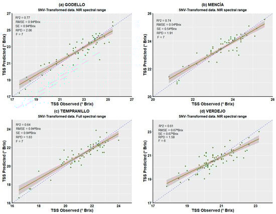 As for the PLS regression models using the NIR range spectra (Table 4), the best statistics were obtained for Godello: R2 = 0.75, RMSE = 0.98 °Brix, RPD = 1.97, and F = 7. For red grapes, Mencía obtained the best results (R2 = 0.72, RMSE = 0.55 °Brix, RPD = 1.87, and F = 7). SNV transformation yielded better R2 values, reduced RMSE values, and improved RPD values for all the varieties for the same F. Using the lowest possible F in PLS regression models is recommended, as it keeps the models simple [].