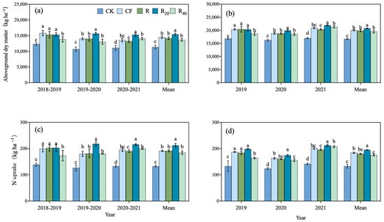 Nitrogen application significantly increased aboveground DM (dry matter) averaged across the three years (Figure 2a,b). Compared with CK, winter wheat and summer maize aboveground DM increased by 26.86% and 19.89%, respectively. In the third year, aboveground DM increased significantly in R20. Compared with CF, R20 significantly increased winter wheat and summer maize aboveground DM by 12.43% and 4.93%, respectively. Averaged across the three years, N application increased winter wheat N uptake by 45.59%, compared with CK (Figure 2c,d). Nitrogen application also increased summer maize N uptake by 38.22%, compared with CK. In the third year, compared with CF, R20 significantly increased winter wheat and summer maize N uptake by 10.49% and 5.14%, respectively.