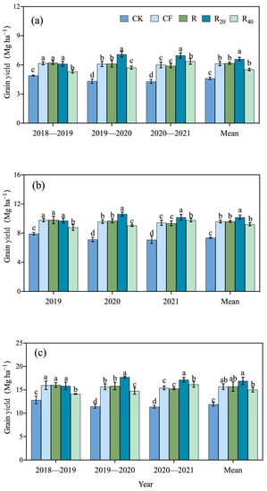 Averaged across the three years, annual grain yields in CF and R were 15.69 Mg ha−1 and 15.71 Mg ha−1, respectively, with no significant difference, and compared with CK, yields increased by 32.00% (CF) and 32.13% (R). The highest annual grain yield was in R20, with yield increasing by 42.15%, 7.69%, 7.58%, and 12.50% compared with that in CK, CF, R, and R40, respectively. Annual grain yield in R40 increased year to year. In the third year, the yield in R40 was higher than that in CF and R, but the average annual grain yield over three years was lower in R40 than in CF and R by 4.46% and 4.59%, respectively.