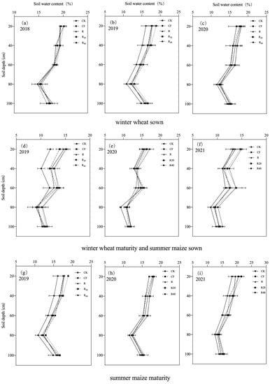 Soil water content in the 0–100-cm soil profile was measured in different treatments at sowing of winter wheat and summer maize and harvest of summer maize (Figure 4). As soil depth increased, soil water content decreased, but at 100 cm, there was a slight increase. In 2018–2020, at winter wheat sowing, average soil water content was ranked R20 > R40 > R > CF > CK. In 2019–2021, at summer maize sowing, soil water content was generally ranked R40 > R20 > R > CF > CK. In 2019–2021, at summer maize harvest, soil water content was generally ranked R20 > R40 > CF > R > CK.