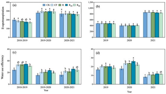 There was no significant difference in evapotranspiration between winter wheat and summer maize rotation system (Figure 5a,b). Compared with CK, the 3-year average WUE of winter wheat and summer maize increased by 39.27% and 29.73%, respectively, with increases of 35.28% and 19.94% in 2018–2019, 37.42% and 35.17% in 2019–2020, and 47.15% and 37.71% in 2020–2021, respectively (Figure 5c,d). There was no significant difference in WUE of winter wheat and summer maize between CF and R. The best water utilization in the winter wheat–summer maize rotation system was in R20. Compared with CF, the 3-year average WUE of winter wheat and summer maize in R20 increased by 10.87% and 6.49%, respectively.