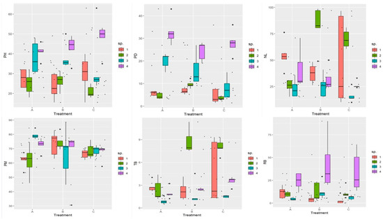 Box plot and dispersion of Experiment 1 for total height of the plant (PH in cm), population density per pot (PD), number of live leaves (NL), plant moisture (PM in %), total biomass (TB in g plant−1), and root biomass (RB in g plant−1). Where species (sp.) is 1 = Stylosanthes macrocephala, 2 = Arachis pintoi, 3 = Brachiaria humidicula, and 4 = Paspalum notatum, and treatment is A = control, B = soil + NPK + limestone filler, and C = soil + limestone filler.