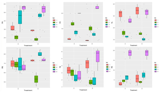 Box plot and dispersion of Experiment 2 for total height of the plant (PH in cm), population density per pot (PD), number of live leaves (NL), plant moisture (PM in %), total biomass (TB in g plant−1), and root biomass (RB in g plant−1). Where species (sp.) is 1 = Stylosanthes macrocephala, 2 = Arachis pintoi, 3 = Brachiaria humidicula, and 4 = Paspalum notatum, and treatment is A = 80% and B = 40% of the field capacity.