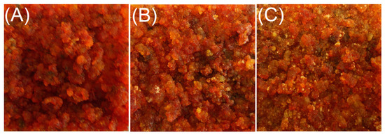 The callus cultures, derived from red beet tubers, were characterized by intensive red pigmentation. The control line was quite uniformly red-pigmented (Figure 1A). The salt-acclimated calli were also predominantly composed of red-pigmented tissue, but the bright-red, yellowish, and greenish clumps of the callus were discernible (Figure 1B,C).