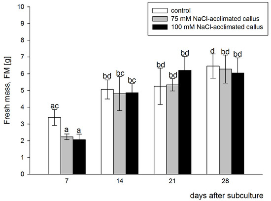 Callus FM gradually increased in all lines over the culture period. The results of the two-way ANOVA indicated a significant difference in FM between the sampling points (F = 64.025, p < 0.001). However, the largest FM increments occurred during the first 14 days of the culture period, resulting in significant differences in the FM between the values determined at the two first sampling points. Measurements performed 21 and 28 days after subculture show that growth increments, occurring during the second half of the culture period, were smaller, with negligible differences between the sampling points. The tissues acclimated to salinity were characterized by comparable FM to one of the control line when analyzed during subsequent sampling points. No significant differences in the FM were detected between the tested lines at all sampling points. At the first sampling point, i.e., 7 days after subculture, the acclimated lines displayed smaller FM than the control one, but as mentioned above, the difference did not pass the significance test (Figure 2). Comparing the difference in the FW between the 7th and 14th day of culture shows a higher increase in the FW in the salt-acclimated lines (115% and 136%, for 75 mM NaCl- and 100 mM NaCl-acclimated callus, respectively), as compared to the control line (49%). However, no statistically significant differences were detected between the tested lines (F = 3.217, p = 0.052), and no interaction between the callus line and sampling points was detected (F = 1.302, p = 0.281). These data show that the 75 mM or 100 mM NaCl-acclimated lines are not deficient in their growth rate with respect to the control line grown on the salt-free medium.