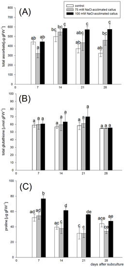 Ascorbate (A), glutathione (B), and proline (C) content in the red beet tuber−derived callus acclimated to 75 (grey bars) or 100 mM NaCl (black bars) or cultured on basal medium (control, white bars). The metabolites were assessed after 7, 14, 21, and 28 days of the four−week−long culture period. Different letters denote significant differences at p < 0.05.
