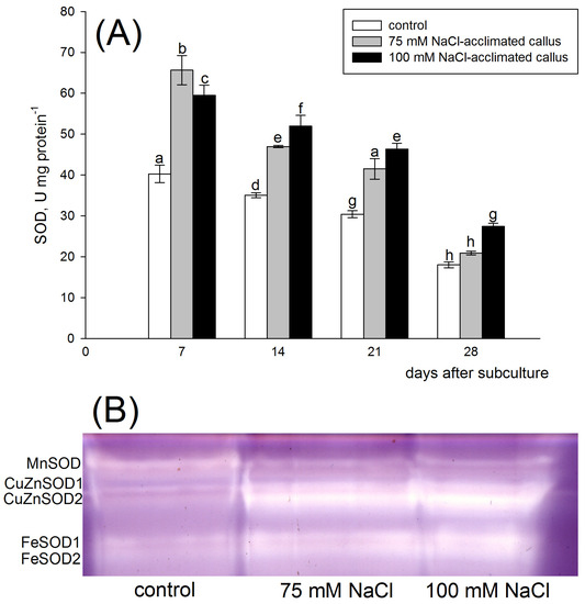 Total superoxide dismutase (SOD) activity (A) and zymogram analysis of SOD isoenzymes (B) in the red beet tuber−derived callus acclimated to 75 (grey bars) or 100 mM NaCl (black bars) or cultured on basal medium (control, white bars). SOD activity was assessed after 7, 14, 21, and 28 days of the four−week−long culture period. Different letters denote significant differences at p < 0.05. SOD isoenzyme analysis was performed 14 days after subculture.