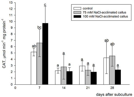 Catalase (CAT) activity in the red beet tuber−derived callus acclimated to 75 (grey bars) or 100 mM NaCl (black bars) or cultured on basal medium (control, white bars). CAT activity was assessed after 7, 14, 21, and 28 days of the four−week−long culture period. Different letters denote significant differences at p < 0.05.