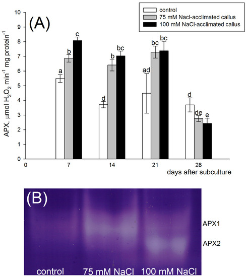 Ascorbate peroxidase (APX) activity (A) and zymogram analysis of APX isoenzymes (B) in the red beet tuber−derived callus acclimated to 75 (grey bars) or 100 mM NaCl (black bars) or cultured on basal medium (control, white bars). APX activity was assessed after 7, 14, 21, and 28 days of the four−week−long culture period. Different letters denote significant differences at p < 0.05. APX isoenzyme analysis was performed 14 days after subculture.