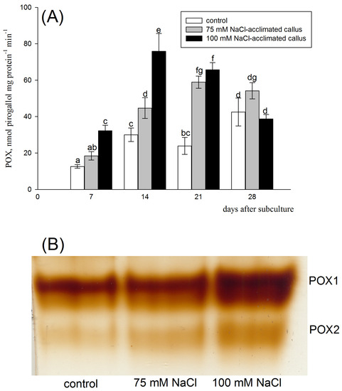 Class III peroxidase (POX) activity (A) and zymogram analysis of POX isoenzymes (B) in the red beet tuber−derived callus acclimated to 75 (grey bars) or 100 mM NaCl (black bars) or cultured on basal medium (control, white bars). POX activity was assessed after 7, 14, 21, and 28 days of the four−week−long culture period. Different letters denote significant differences at p < 0.05. POX isoenzyme analysis was performed 14 days after subculture.