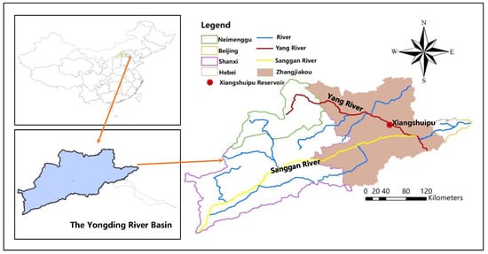 The Yongding River basin is one of the seven major river systems in the Haihe River basin, located between 112° and 117°45′ E, and between 39° and 41°20′ N. The upper reaches flow through Neimenggu, Shanxi, Hebei, and Beijing; and consist of two major tributaries, the Yang and Sanggan Rivers, covering 43,000 km2, which accounts for 93% of the total area of the Yongding River basin (Figure 1). The Yongding River basin has a temperate continental monsoon climate with four distinct seasons. Annual precipitation is concentrated between June and September, and the average annual precipitation is between 360 and 650 mm. The Xiangshuipu Reservoir is located on the Yang River and the study area mainly includes the Zhangjiakou City, Hebei Province. There are four medium-sized irrigations and one large-sized irrigation around the Xiangshuipu Reservoir, with an average agricultural water consumption of 4.88 × 108 m3 from 2015 to 2021, and an average annual precipitation of 422 mm. The high demand for agricultural water and the scarcity of rainfall have made the problem of water shortage increasingly prominent, bringing great challenges to economic and social development and ecological civilization construction.