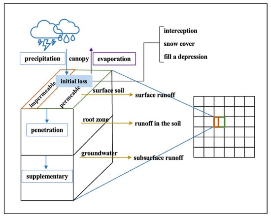 The WetSpa model, proposed in 1996 [37], is a distributed hydrological model based on physical mechanisms for simulating water–air transport and energy exchange among the soil, vegetation, and atmosphere at the daily watershed scale (Figure 2). The model considers the processes of precipitation, interception, snowmelt, depression, infiltration, evapotranspiration, surface runoff, and subsurface runoff, and uses a multi-layer model to represent the water and energy balance of each grid cell. The grid cell size was set to 1 × 1 km, and 11 flow production parameters and 4 sink parameters were involved in determining the flow rate model. The flow production process is calculated using the grid as a unit, and the flow confluence process is calculated according to the upstream and downstream relationships one-by-one sub-basin.