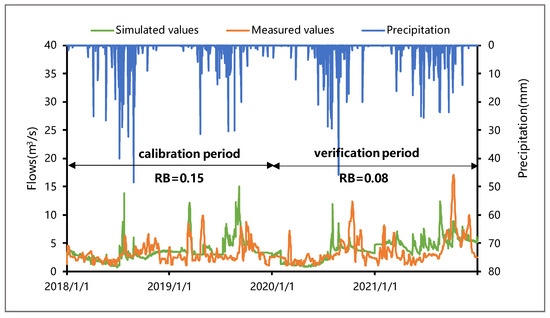 where is the simulated value of t-time flow; is the observed value of t-time; and RB is the relative biases of the simulated value and the measured value. The closer the RB value is to 0, the smaller the difference between the simulated flow and the measured flow. When |RB|< 0.2, the simulation results are considered acceptable.