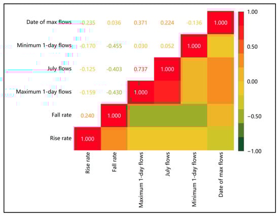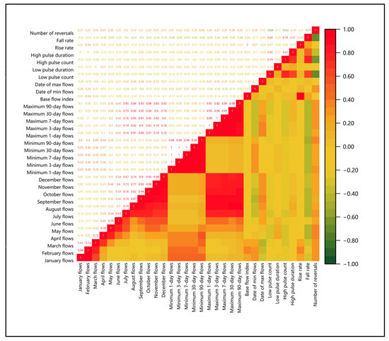 The daily runoff of the Xiangshuipu section from 1962 to 2021, was used as the data to calculate the IHA indicators. According to the simulation results, there were no zero flow days in the Xiangshuipu section; thus, the number of days of the breakage index was removed, and only the remaining 32 indices were analyzed. Figure 5 demonstrates the correlations among the indicators, which were strong, with absolute values of correlation coefficients >0.9. Specifically, there was a strong correlation between the annual maximum 7-, 30- and 90 day flows and the July, August, and September flows. There was also a strong correlation among October, November, and December flows. There is high autocorrelation among the IHA indicators, and the problem of information redundancy is prominent.