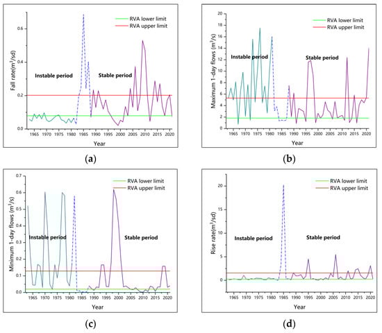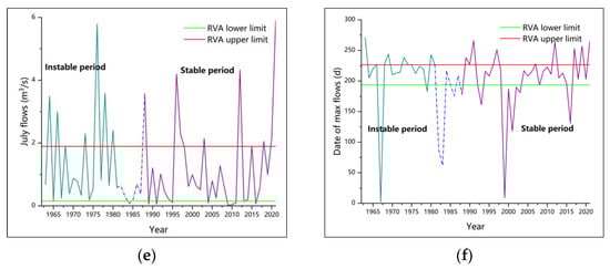 The RVA thresholds and hydrological alteration of the ERHIs during the stable period was calculated based on the variation period of the Xiangshuipu section; thus, 1989–2021 was considered as the stable period. As shown in Table 6, two ERHIs were moderately altered and four ERHIs were slightly altered. Figure 7a,b show that the fall rate almost always lies outside the lower limit of the RVA during the unstable period, and the maximum 1 day flows mostly fall outside the upper limit of the RVA threshold during the unstable period with moderate hydrological alteration. The minimum 1 day flows (Figure 7c); rise rate (Figure 7d); July flows (Figure 7e); and the dates of maximum flow (Figure 7f), which are indicators of the dry period, have a low degree of variation. Generally, the overall hydrological alteration in the Xiangshuipu section was low.