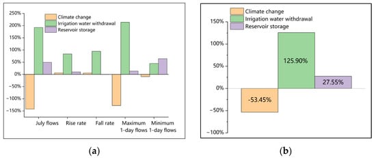 As the absolute value of Vi,1 of the date of maximum flows was too small (2.75%), this indicator was not considered. Only the five remaining indicators were analyzed for the driving factors contribution rate. First, the water withdrawal data were interpolated and extended to meet the data length requirements for the stable period. The contribution rate of each driving factor was calculated using Equations (2)–(7). Figure 8a shows the contribution of each driving factor to the changes in EHRI values. The indicators were mainly influenced by water withdrawal from the irrigation, except for the minimum 1 day flows which is strongly influenced by reservoir storage. Among them, water withdrawal had the greatest impact on the maximum 1 day and July flows. In addition, climate change had a negative impact on the maximum 1 day and July flows.