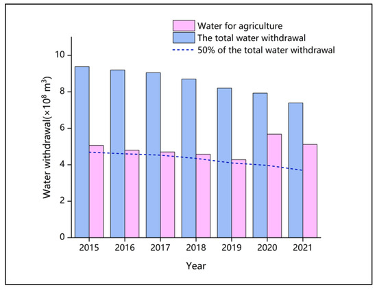 Changes in the hydrological conditions are mainly influenced by human activities, among which water withdrawal is the most influential. From the different ERHIs, the maximum 1 day and July flows were most influenced by water withdrawal. Both these indicators were in the crop-growing period when agricultural water use was higher. China implemented its land reform policy in 1978. This policy was implemented in the Yang River in the early 1980s and led to a significant increase in agricultural water use. Xiangshuipu is located in Zhangjiakou City, where agricultural production is an important economic source for the local area. According to the statistical bulletin of Zhangjiakou City from 2015 to 2021, the agricultural water use in Zhangjiakou City in all years accounted for more than 50% of the total water use in that year (Figure 9), with an overall upward trend in agricultural water use. In addition, the Xiangshuipu section is adjacent to the Yang River II Irrigation (a large irrigation) and four other medium-sized irrigations. Accelerated agriculturalization and rapid economic development during this period also led to increased water withdrawal from the irrigation.