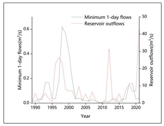 Although the influence of reservoir storage on the overall hydrological conditions was small, the minimum 1 day flows were mostly influenced by the effect of reservoir storage. Figure 10 shows the course curves of the outflow and minimum 1 day flows from the Xiangshuipu Reservoir during the stabilization period. The rise and fall trends of the minimum 1 day flows coincide with the outflow of the reservoir. This indicates that during the dry period, the storage effect of the upstream reservoir has a significant influence on the runoff process of the downstream section, which can reduce water shortage problems, such as basin outflow during the dry period.