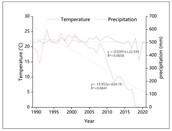 Climate change has a negative impact on the evolution of hydrological conditions, with the greatest impact on the maximum 1 day and July flows. The maximum 1 day flows occur mostly from June to August; therefore, the average rainfall and temperature from June to August of each year during the stability period were analyzed. As shown in Figure 11, although temperature showed an insignificant downward trend (R2 = 0.06); the downward trend in precipitation was significant (R2 = 0.68). Precipitation is an important source of runoff, and a decrease in precipitation leads to a decrease in river runoff. The analysis of Figure 7b,e show that both the maximum 1 day and July flows show an increasing trend during the stabilization period. Under the combined action of different meteorological factors, climate change negatively affected the evolution of hydrological conditions.
