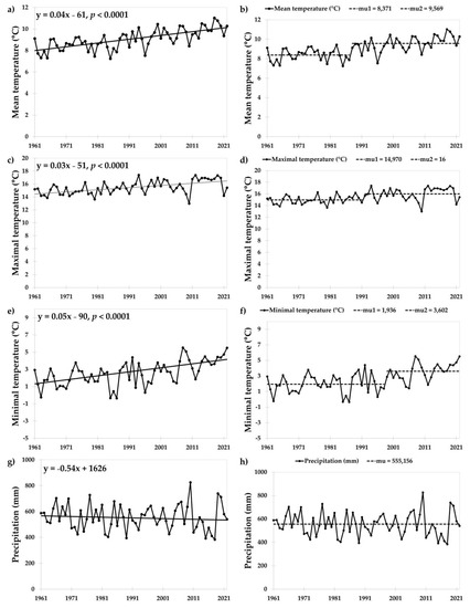 The development of (a) mean, (c) maximal, and (e) minimal temperatures (°C) and (g) precipitation (mm) between 1961 and 2022 (annual values). Separation of periods with different temperatures: (b) mean (1987), (d) maximal (1991), and (f) minimal temperatures (1998) and (h) precipitation.