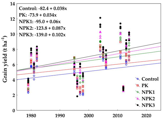 All fertilization treatments exhibited a statistically significant increasing trend over time, as determined by the Mann–Kendall trend test (p < 0.05). Even the unfertilized Control confirmed that the growth of wheat in the South Moravian region is sustainable, even without fertilizer inputs (Figure 2), when wheat follows alfalfa in the crop rotation. The treatments with the lowest inter-seasonal increase in grain yields were PK (Sen’s slope value of 34 kg ha−1 season−1) and the Control (38 kg ha−1 season−1). They were followed by NPK1 (60 kg ha−1 season−1), NPK2 (87 kg ha−1 season−1), and NPK3 (102 kg ha−1 season−1) treatments.