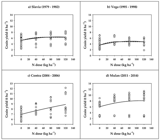 The response of (a) Slavia, (b) Vega, (c) Contra, and (d) Mulan wheat varieties to N dose (kg ha−1). Data are interleaved with quadratic (black line) and quadratic-plateau (short dash line) functions.