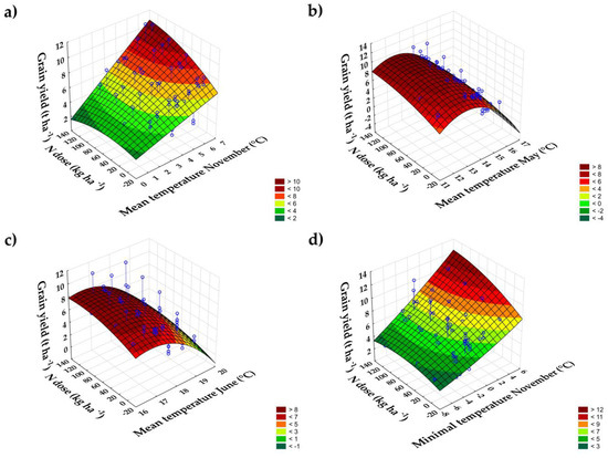 The relationship between grain yield (t ha−1); N dose (kg ha−1); and (a) mean temperature in November (°C), (b) mean temperature in May (°C), (c) mean temperature in June (°C), and (d) minimal temperature in November (°C). The color legend at the bottom right represents the grain yield rate (t ha−1).