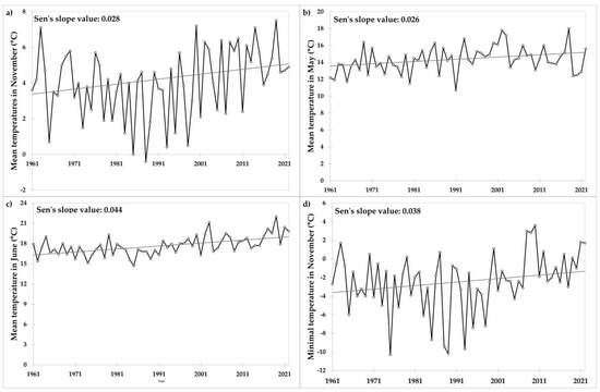 The development of (a) mean temperatures in November (°C), (b) mean temperatures in May (°C), (c) mean temperatures in June (°C), and (d) minimal temperatures in November (°C).
