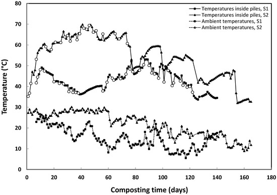 Temperature and aeration are essential parameters in a composting process [17]. The composting material was turned and mixed by a bridge turner for its cooling and aeration 34 and 22 times during S1 and S2, respectively. Turning was carried out according to the temperature measured every hour daily. In the beginning, turning was conducted very frequently to achieve the homogenisation of materials. Proper aeration allows temperature control, eliminates excess moisture and CO2, and provides O2 for biological processes [16]. The temperature values obtained inside each pile during the processes, and the ambient temperatures and turnings carried out during both seasons, are shown in Figure 1. During S1, the process occurred within the upper range of mesophilic temperatures (T < 55 °C). These temperatures allow greater mass loss because they maximise the biodegradation rate [42]. However, thermophilic temperatures (T > 55 °C) were not reached because the maximum value was 53 °C, obtained on days 88 and 89. Although this temperature may be insufficient to ensure the complete sanitation of the resulting products, the microbiological analyses of final composts showed E. coli contents less than 1000 MPN g−1 and the absence of Salmonella spp. in 25 g, meeting the legislation requirements [41]. The difficulty in reaching high temperatures was probably due to the initial stability of the employed SS. Indeed Maulini-Duran et al., (2002) [43] demonstrated that composting processes of wastewater sewage sludge biologically treated by anaerobic digestion attained lower temperatures than raw sludge composting due to the significant stabilisation of organic matter in digested sludge. According to the obtained data, an increase in the initial proportion of RS was considered to favour a more vigorous process and to increase the RS management capacity of the commercial facility. Thus during S2, the RS:SS ratio of 1:6 (w:w) was used. This ratio made it possible to reach higher temperatures: from 67 °C to 70 °C for 40–48 composting days. This compost was acceptable in sanitation terms (absence of Salmonella spp. in 25 g and <1000 MPN g−1 of Escherichia coli). During both processes, at around 127 days of composting the temperature began to not substantially increase after turnings, which indicates the beginning of the maturation phase.