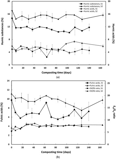 Evolution of humic substances and humic acids contents (a) and fulvic acids contents and E4/E6 ratio of the humic acids (b) during the composting processes. Vertical bars indicate standard deviation (n = 8).
