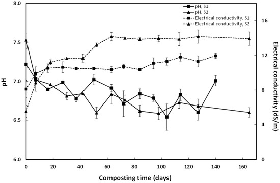 Evolution of pH and EC during the composting processes. Vertical bars indicate standard deviation (n = 8).
