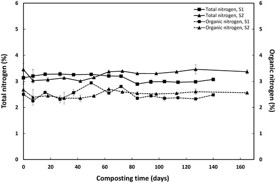 Evolution of total and organic nitrogen during the composting processes. Vertical bars indicate standard deviation (n = 8).
