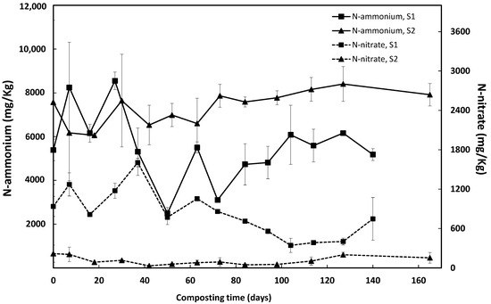 The mineral N, NH4+-N and NO3−-N concentrations (Figure 7) varied throughout the process during both seasons. During S1, the NH4+-N concentration lowered by 4% after 140 days of composting. This reduction could have been due to nitrification and NH3 volatilisation [50]. However, volatilisation was not favoured due to the moderate pH values of processes (pH < 8) [51]. On the contrary, during S2 NH4+-N increased by 5% after 165 days of composting, probably because of the predominance of the ammonification process, which converts organic N into NH4+ [23].