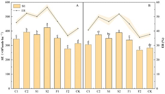 Effects of different fertilization treatments on seedling emergence rate in 2021 (A) and 2022 (B). The line chart represents the emergence rate (ER). The column chart represents the number of seedling emergence (SE), and the shaded areas of the line chart indicate positive and negative standard errors. Bars show mean standard error, and different lowercase letters above the bars indicate that the difference was significant at p < 0.05 under the LSD test. (The same below.).