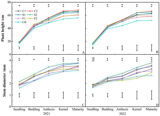 Changes in plant height (A) and stem diameter (C) in 2021 and plant height (B) and stem diameter (D) in 2022 under different growth stages and different treatments of oilseed flax. Bars show mean standard error between treatments. NS, *, **, *** indicate non-significant, significant, or extremely significant between treatments at p < 0.05, p < 0.01, or, p < 0.001, respectively. (The same below.).