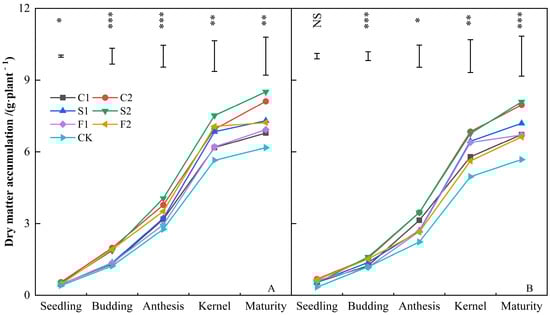 Effects of different fertilization treatments on dry matter accumulation of oilseed flax in 2021 (A) and 2022 (B). NS, *, **, *** indicate non-significant, significant, or extremely significant between treatments at p < 0.05, p < 0.01, or, p < 0.001, respectively.