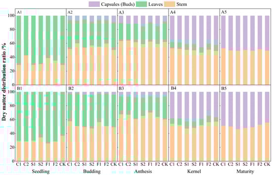 Effects of different fertilization treatments on dry matter distribution of oilseed flax at seedling stage (1), budding stage (2), anthesis stage (3), kernel stage (4), and maturity stage (5) in 2021 (A) and those in 2022 (B).