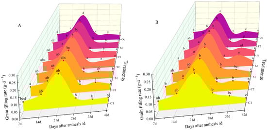 Effects of different fertilization treatments on grain filling rate at different days after anthesis in 2021 (A) and 2022 (B). Different lowercase letters represent significant differences between different treatments at the p < 0.05 level on the same day after anthesis.