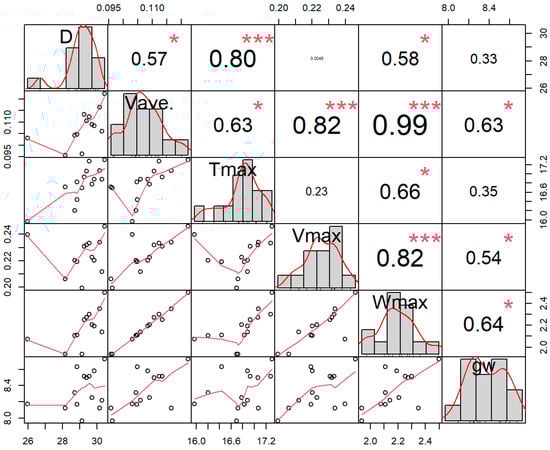 Correlation analysis between characteristic parameters of oilseed flax grain filling and 1000-grain weight. The gw indicates 1000-grain weight (g). The panels with vertical bars (diagonal from top left to bottom right) show the distribution of each variable. The values of the X and Y axis indicate the data size range of the corresponding index. The triangular panel (below the diagonal of the histogram) is a scatter plot of the two variables of interest. The upper triangular panel (above the diagonal of the histogram) gives the number representing the correlation coefficient between any variable, and *, *** represent significant correlations at the 0.05, 0.001 probability levels, respectively. (The same below).