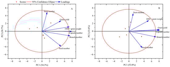 Principal component analysis of grain yield components of oilseed flax in 2021 (A) and 2022 (B). Seed number indicates the seed number per capsule. Branch number indicates the branch number of the main stem. Capsule number indicates the effective capsule number.