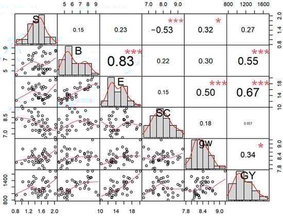 Correlation analysis between grain yield and its components. The S indicates the stem number. B indicates the branch number of the main stem. E indicates the effective capsule number. SC indicates the seed number per capsule. GY indicates the grain yield. *, *** indicate significant, or extremely significant between treatments at p < 0.05, or, p < 0.001, respectively.