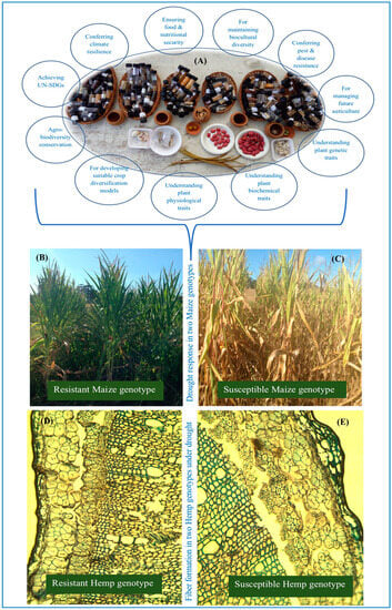 Maintaining plant genetic diversity is not only essential for food production and thereby achieving the associated UN-SDGs, but also imperative to maintaining the biocultural diversity of local people and also for conffering improved traits in crop plants under futuristic climatic conditions. (A) Some of the indicative benefits of maintaining plant genetic diversity such as agrobiodiversity conservation, developing sustainable crop diversification models, and also for understanding the biochemical as well as physiological responses in plants. (B) Drought response in a resistant maize genotype and (C) the response in a susceptible Maize genotype. (D) The fibre formation in a hemp genotype (resistant) in response to drought and (E) the fibre formation in susceptible hemp genotype.