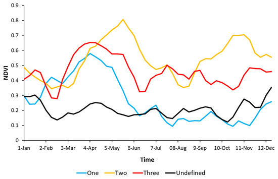 Mean NDVI seasonal cycles for the 2016–2020 period. Croplands with one, two, and three seasonal cycles are displayed in cyan, orange, and red. Unclear seasonality in black.