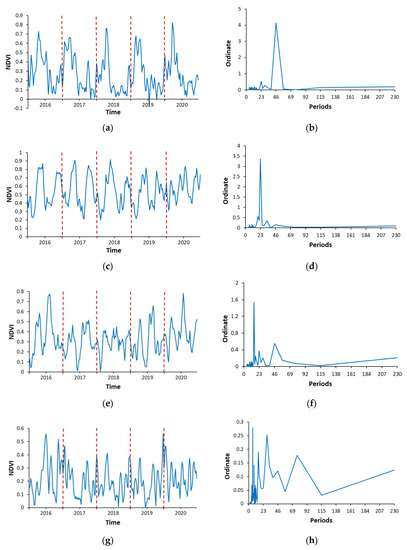 Examples of NDVI time series (left) and their periodograms (right) for the period 2016–2020 of four cropland pixels prototypical of different seasonality: one seasonal cycle (a,b), two seasonal cycles (c,d), three seasonal cycles (e,f), and with an undefined pattern (g,h). Red lines separate periods of 46 MODIS observations (one year).