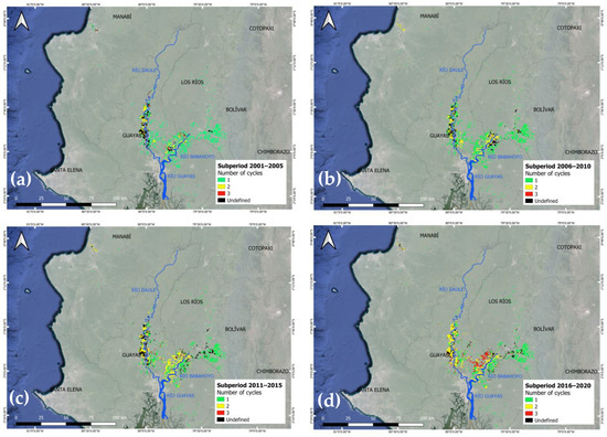 Figure 4 shows the spatial distribution of the cropping systems for the different subperiods 2001–2005 (a), 2006–2010 (b), 2011–2015 (c), and 2016–2020 (d). Areas with one, two, and three crop growth cycles are displayed in green, yellow, and red, respectively. Areas with an undefined seasonality are colored in black. Double- and triple-cropping systems are mainly located in the surroundings areas of Daule and Babahoyo rivers, whereas croplands with one seasonal cycle can be found in areas further away from these watercourses.